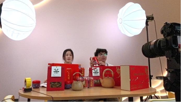 “快看这琥珀色的茶汤!清澈透亮,天然好茶色,看一眼就爱上!” 直播一开始,由市场营销等专业学生组成的主播团轮番登场,将课堂知识灵活搬进了直播间。他们运用消费者行为学理论,精准捕捉观众对传统文化和特色产品的兴趣点;活用网络营销课程中的直播话术与互动技巧,巧妙以“三皮泡一罐”这句当地俗语切入,生动道出了三皮罐方便易制、滋味醇厚的特点。同时,结合市场调研数据,主播们详细介绍了三皮罐——学名“湖北海棠”的天然茶饮在荆楚大地的悠久传承。
