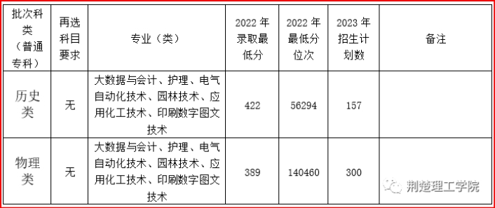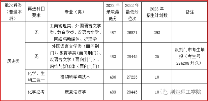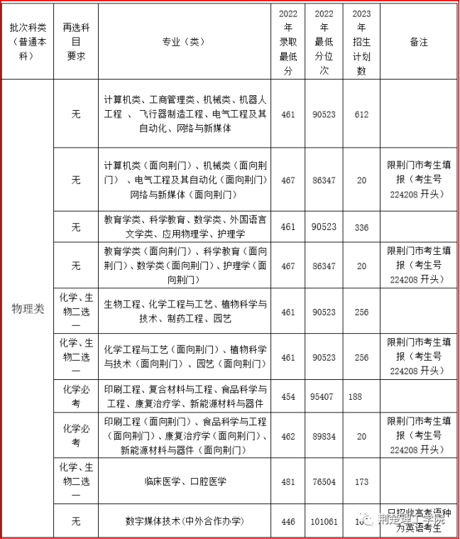 答:本科普通类:2023年我校面向荆门市招生的本科计划100人,专业后带有“(面向荆门)”字样,实行单独编组填报志愿和投档录取,参加2023年普通高考,学籍在荆门的普通类考生可以填报(考生报名号以234208开头)。