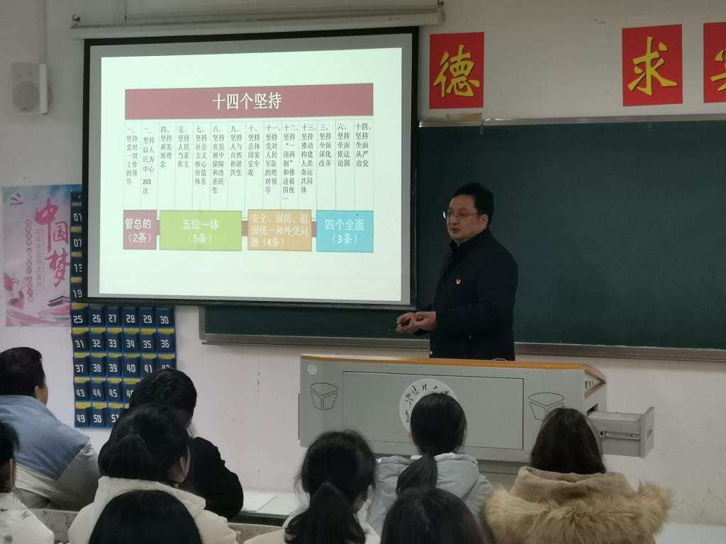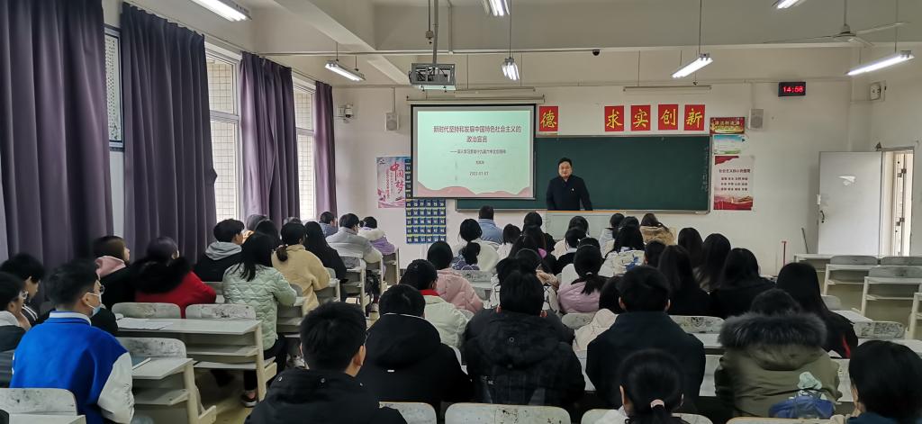 为深入贯彻落实十九届六中全会精神,1月7日下午,副校长刘风华以新时代坚持和发展中国特色社会主义的政治宣言为主题,为2021级工商管理1班学生和太阳集团网tyc9728全体预备党员上了一堂生动的思政课。