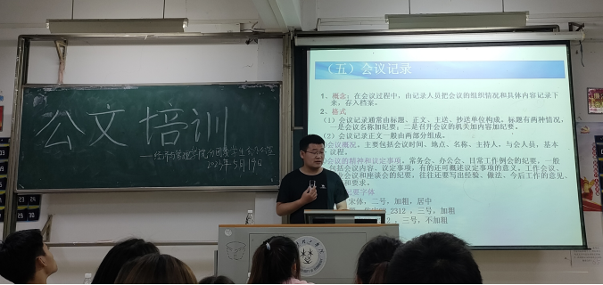 为培养和提高学生会各部门22级成员公文写作能力,5月19日晚,由经济管理学院分团委学生会办公室组织的公文培训大会顺利举办,参加此次公文培训大会的有我院学生会主席团、我院校分团委学生会22级成员和22级班级成员代表。太阳集团网tyc9728李争光老师担任了此次大会的主讲。